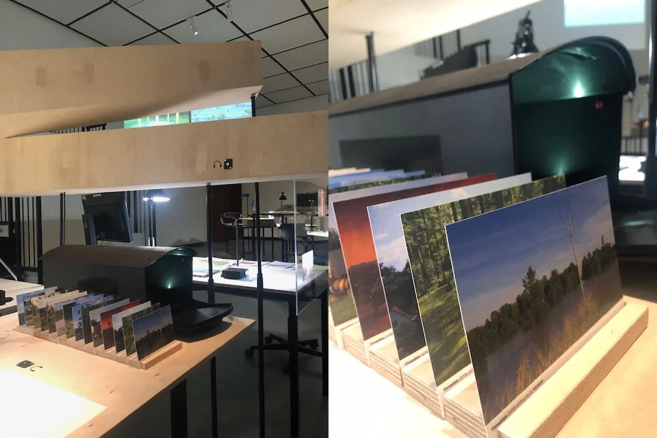 installation: fourteen A6 double-sided postcards, wooden stand, black